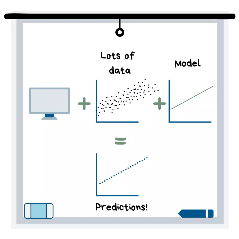 Machine learning is when you load a large amount of data into a computer program and choose a model that will “fit” that data so that the computer (without your help) can come up with predictions. The computer builds models using algorithms that range from simple equations (such as the equation of a straight line) to very complex systems of logic/mathematics that allow the computer to make the best possible predictions.