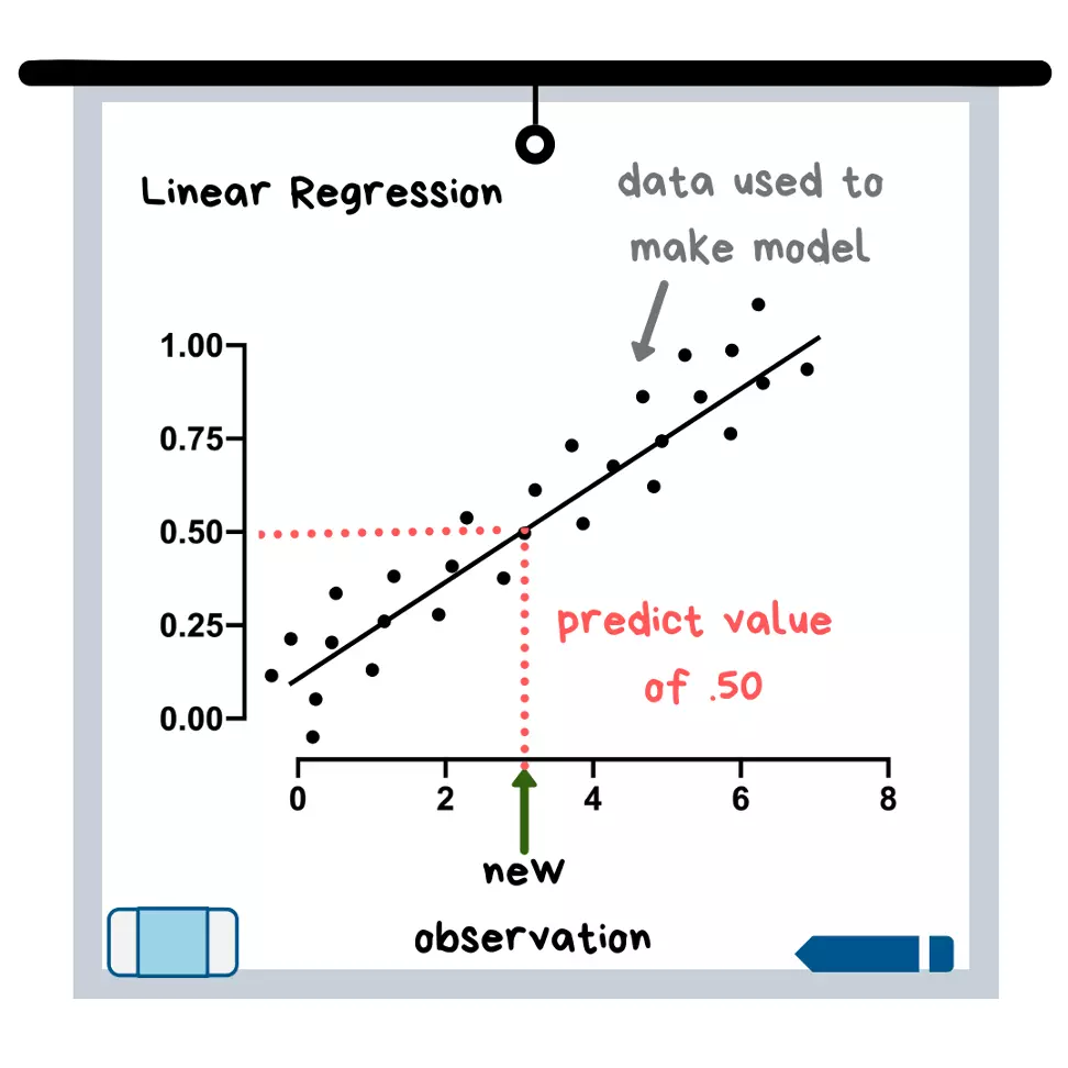 Quite often, linear regression becomes the first machine learning model that people learn. This is due to the fact that its algorithm (in other words, an equation) is quite simple to understand using only one variable x – you simply draw the most suitable line – a concept that is taught in elementary school. The best fitting line is then used to predict new data points (see illustration).