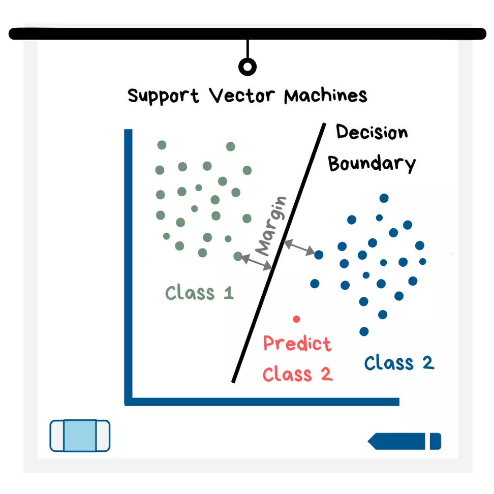 The way it works is also that the machine seeks to find the boundary with the largest limit. The limit is determined by the distance between the boundary and the closest points of each class (see illustration). New data points are then built and placed in a specific class, depending on which side of the boundary they fall on.